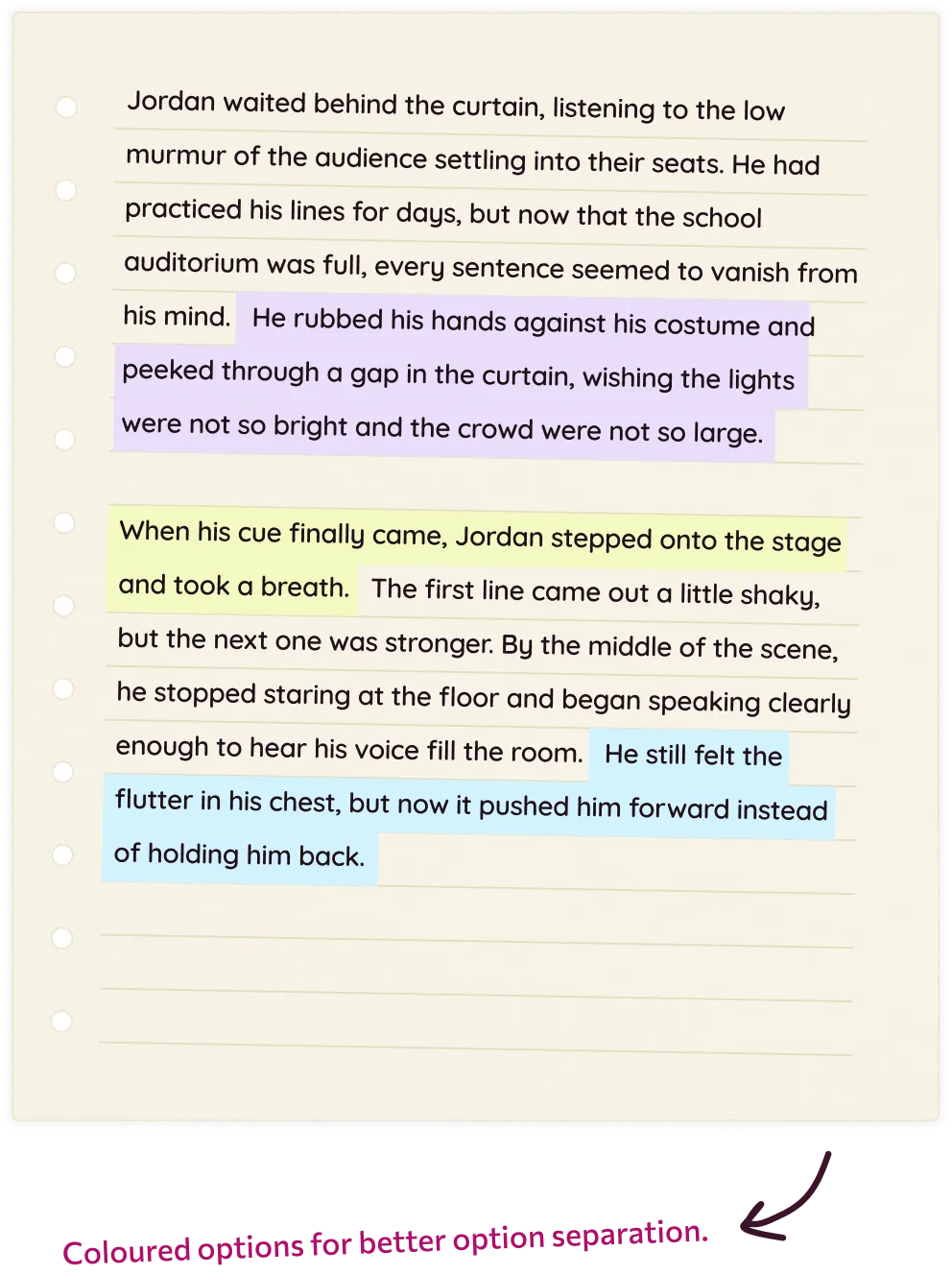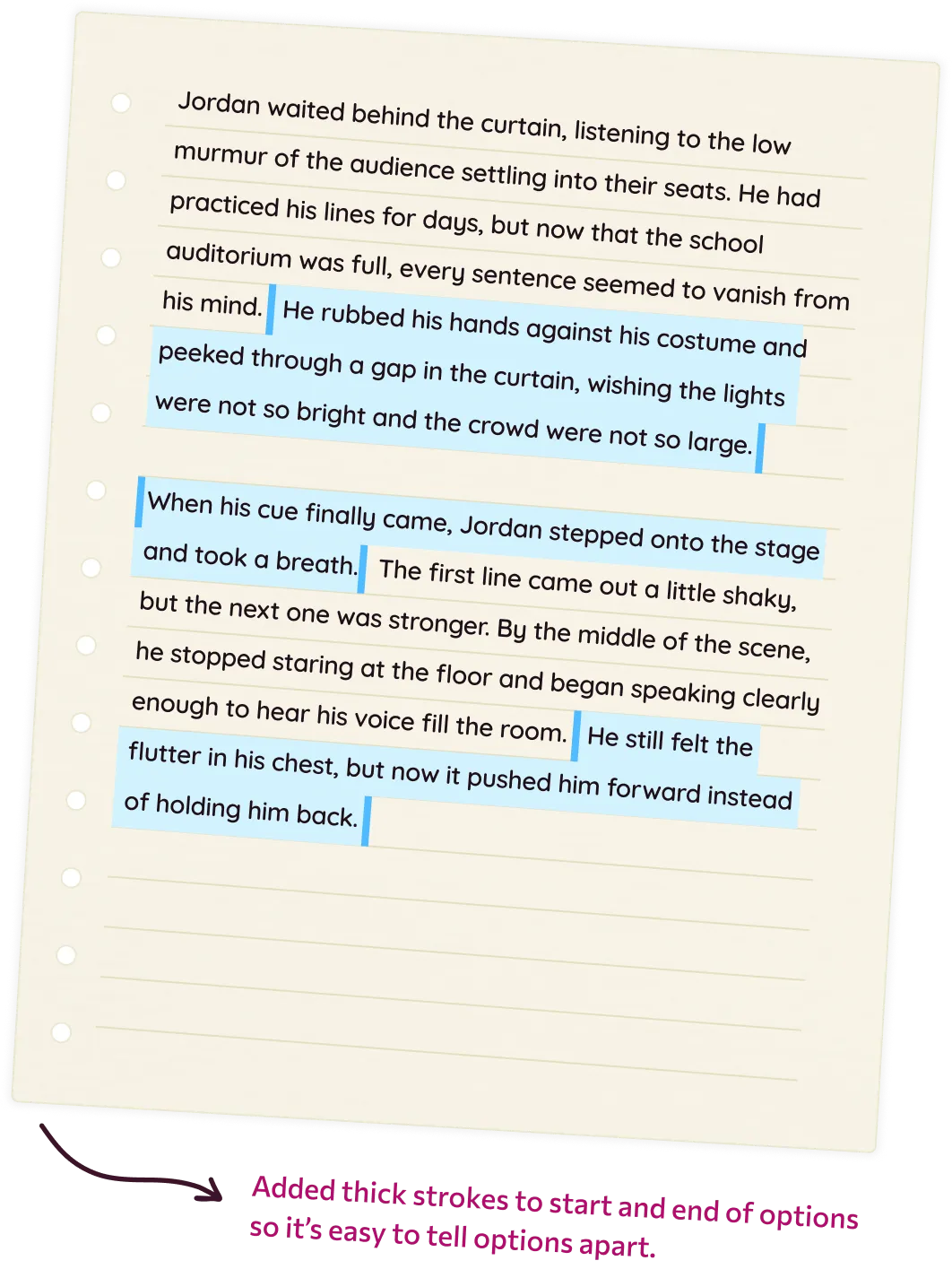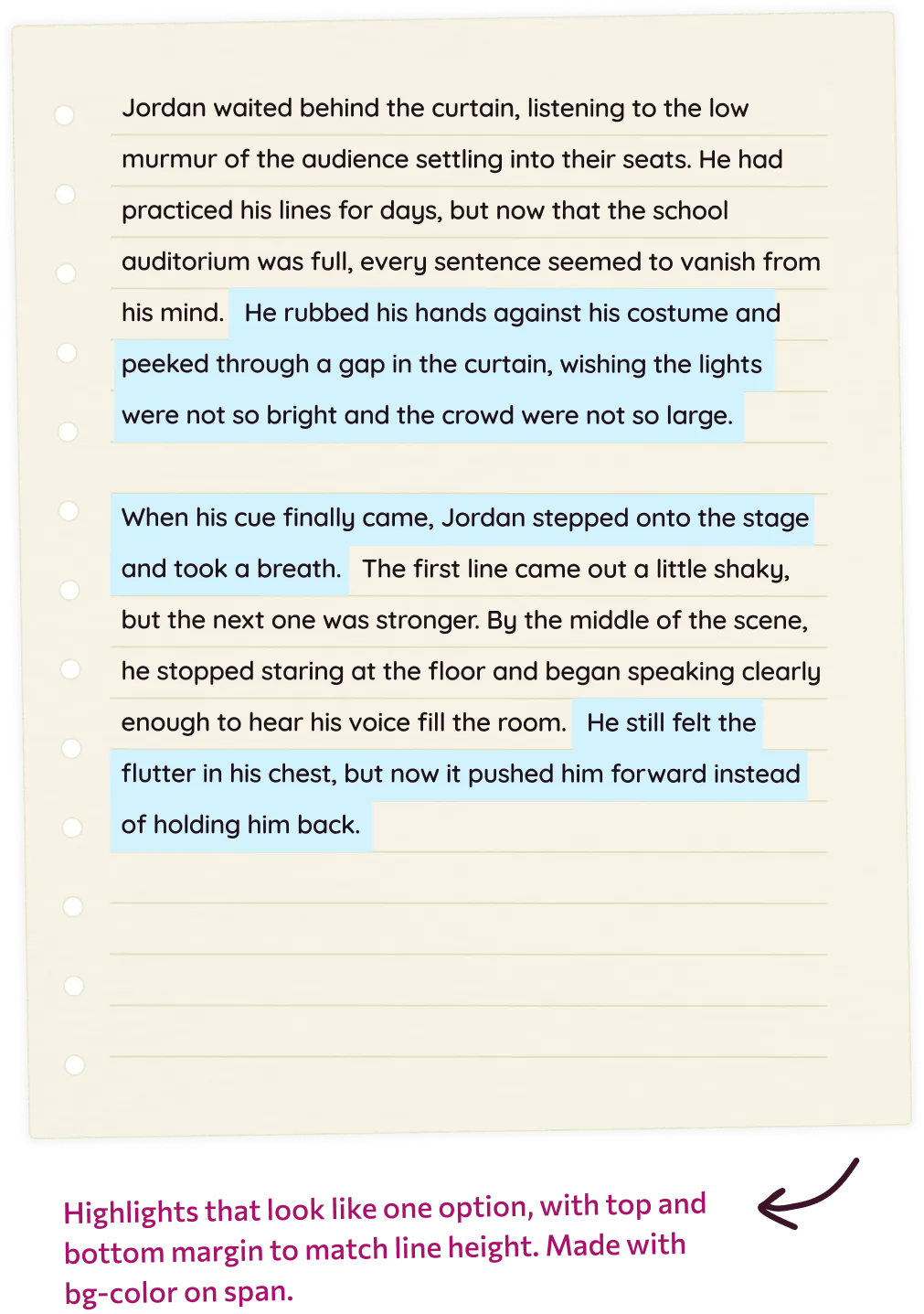 </script> But what if highlights were literally highlighter pen markings? How will highlights work if two sentence options are adjacent to each other?